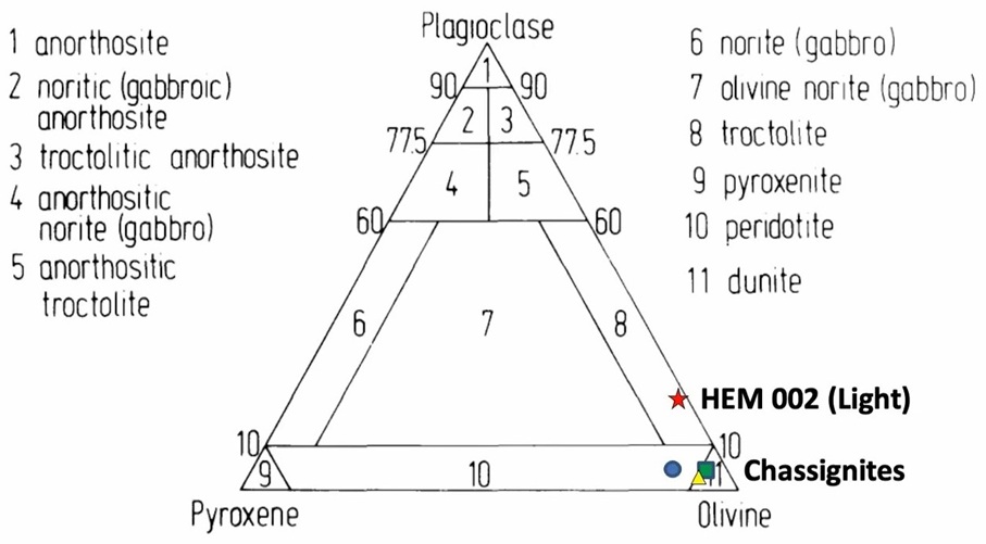 | ii. Plagioclase-bearing (e.g. AhS MS-MU-012 [olv–opx–aug; ~14% plag; archetypal Hughes-type], Hurghada 001 [rare felds. glass; similar to Hughes-type]) |