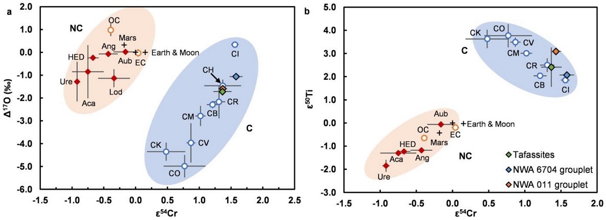 | ∗An alternative classification scheme by Ma et al. (2022) proposes a group, 'Tafassites', composed of 13 type 6–7+ members, and removes both NWA 011 and NWA 6704 grouplets from inclusion (Fig. S-13 [ε54Cr vs. Δ17O and ε50Ti]).