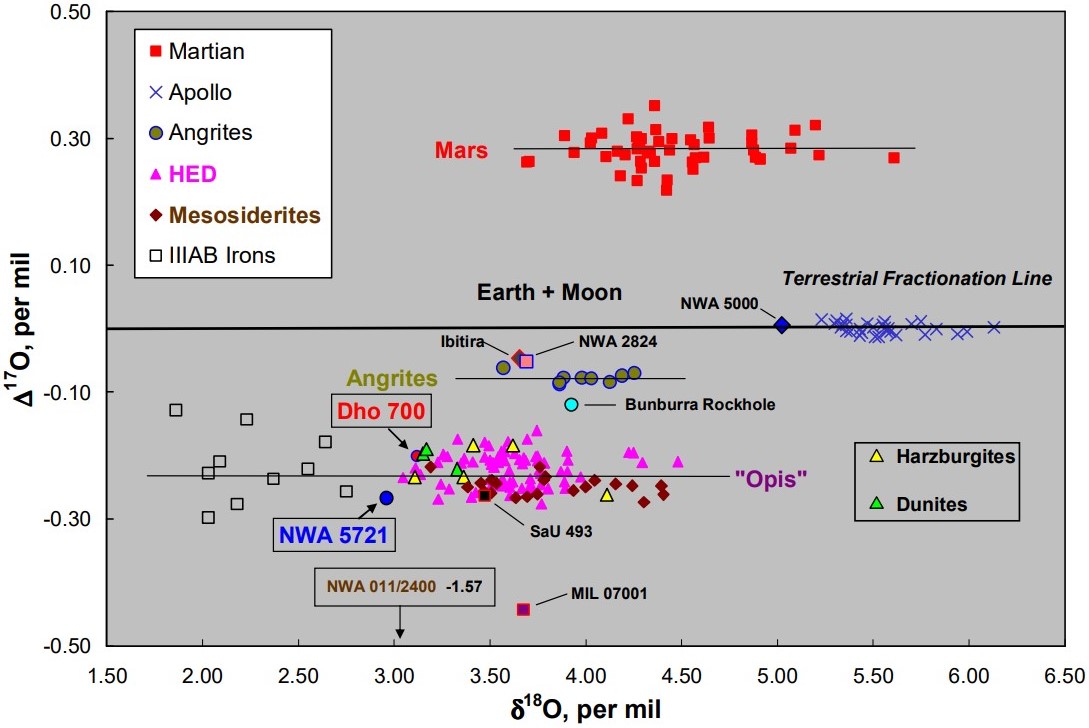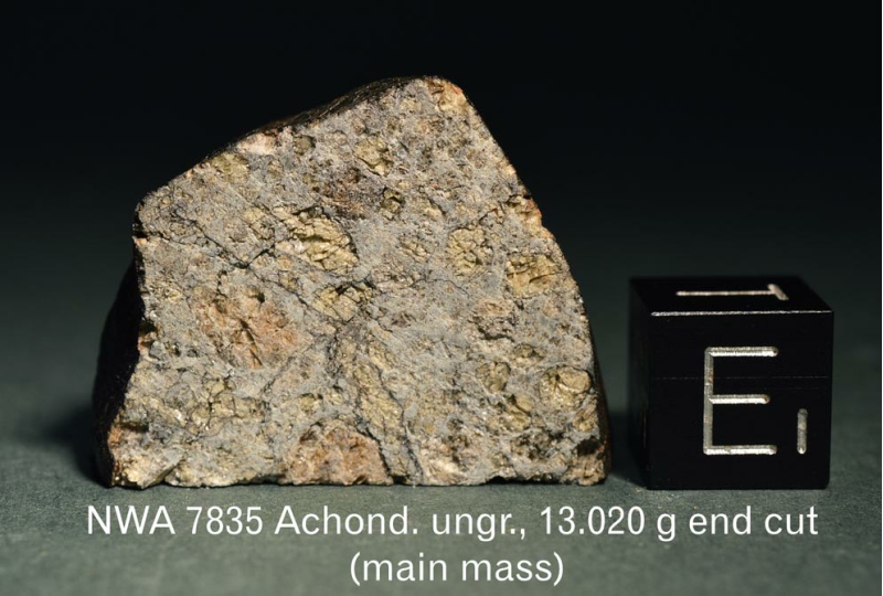 | UNGROUPED ACHONDRITES (e.g. Bunburra Rockhole [euc-like, poss rel to A-881394; photo courtesy of Imperial College London], CeC 050 [aff to NWA 7325 and NWA 11119; abs 1, 2], Dhofar 732 [olv–opx], Dhofar 778 [harzburgite], 2], Erg Chech 002 [euc-like andesite], GRA 06128/9 [tra-andesite, bra-/R chon-like; abs, article 1, 2, 3, 4], Hassi el Madani 002 [LL/CHA? {troctolite}; abs 1, 2], Ibitira [euc-like], Néma 001 [ACA–LOD-rel; abs], NWA 1240, NWA 1840 [E acho], NWA 2824 [euc-like], NWA 4284 [L-like; abs], NWA 4741, NWA 5517 [poss rel to NWA 7325; abs], NWA 5721 [abs, O-plot], NWA 7325, NWA 7822 [CV-like], NWA 7835 [photo courtesy of Stefan Ralew], NWA 8054 [prob lod-anom; abs, O–Cr plot], NWA 8777, NWA 10519 [E acho, <0.01 wt% Si in metal], NWA 11112, NWA 11119 [andesite, aff to NWA 7325 and CeC 050; photo courtesy of Dr. Carl Agee, abs]; NWA 11187 [ure-like], NWA 11562/12969/14879 [prob ure-anom, most magnesian; abs 1, 2, 3; article], NWA 11575 [LL-like bas-andesite; abs 1, 2, 3], NWA 12264 ['CX' trend; abs; article], NWA 12338 [euc-like], NWA 12758, NWA 13188 [bas-andesite, poss terrene; abs], NWA 13272 [L/LL-like], NWA 13921 [euc-/dio-like melt], NWA 13955 [dio-like vesicular cum], NWA 14500, NWA 15201 [poss terrene/lun bas], NWA 15820 [trachyandesite/monzonite; similar O to ALM-A and NWA 11119, but dissimilar based on radiometric anlys; abs 1, 2 {w/ photo}], NWA 15915 [clinopyroxenite, poss launch-paired w/ NWA 13307, NWA 16555, and KG 022], Pasamonte [euc-like], PCA 82502/91007 [euc-like], Serra Pelada [euc-like]; Tin-Essako 001 [poss metal-rich ure; abs]) |
