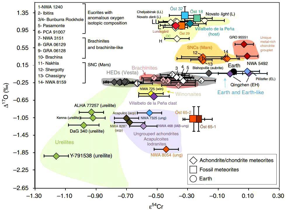 | 3. E achondrites, metal-rich (ε54Cr = –0.26 [±0.03]; δ53Cr = –0.03 [±0.03] ‰) (e.g. Itqiy, MS-MU-019, MS-MU-036, NWA 2526) |